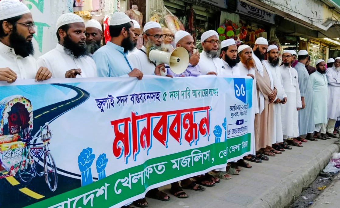 জুলাই সনদ বাস্তবায়নসহ ৫ দফা দাবীতে ভোলায়  মানববন্ধন করেছে খেলাফত মজলিস।