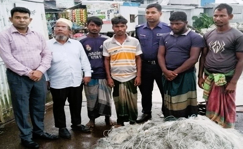 ভোলার লালমোহন উপজেলায় নিষেধাজ্ঞা অমান্য করে নদীতে মাছ শিকারের দায়ে ১৬ জেলেকে আটক করা হয়েছে। মঙ্গলবার (৭ অক্টোবর) ভোর থেকে বিকেল পর্যন্ত উপজেলার তেঁতুলিয়া নদীর বিভিন্নস্থানে অভিযান চালিয়ে তাদের আটক করা হয়। এ সময় জব্দ করা হয় ৫ হাজার মিটার অবৈধ জাল এবং ইলিশসহ বিভিন্ন প্রজাতির ১৫ কেজি মাছ। পরে বিকেলে উপজেলার বদরপুর ইউনিয়নের নাজিরপুর মৎস্যঘাটে আটককৃতদের মধ্যে ১২ জেলেকে পাঁচদিন করে বিনাশ্রম কারাদন্ড প্রদান করেন লালমোহন উপজেলা নির্বাহী কর্মকর্তা (ইউএনও) এবং নির্বাহী ম্যাজিস্ট্রেট মো. শাহ আজিজ। এছাড়া এক জেলেকে ১ হাজার টাকা জরিমানা এবং ৩ জন অপ্রাপ্ত বয়স্ক হওয়ায় তাদের মুচলেকা নিয়ে ছেড়ে দেওয়া হয়। অপরদিকে জব্দকৃত জাল আগুনে পুড়িয়ে ধ্বংস ও মাছ মাদরাসা এবং এতিমখানায় বিতরণ করা হয়। এ সময় লালমোহন উপজেলা মৎস্য কর্মকর্তা আলী আহমদ আখন্দ, থানা পুলিশের সদস্যগণসহ মৎস্য অফিসের বিভিন্ন পর্যায়ের কর্মকর্তারা উপস্থিত ছিলেন।