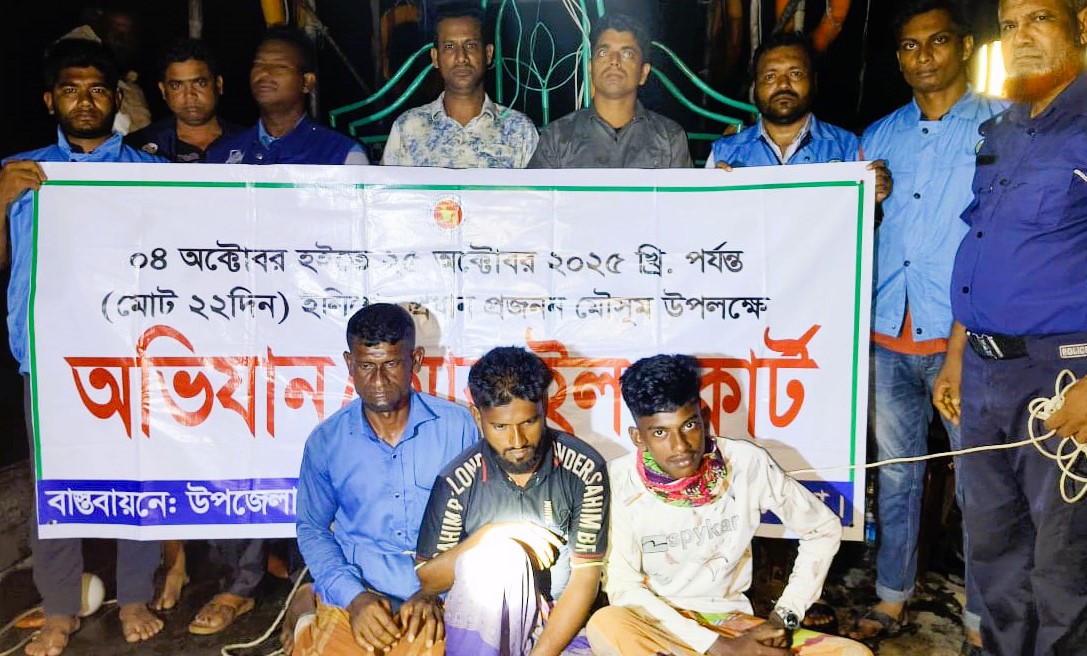 এই সময় একটি ইঞ্জিনচালিত ট্রলারসহ কারেন্ট জাল জব্দ করা হয়। রবিবার রাতভর উপজেলার মেঘনার চরপিয়াল পয়েন্টে অভিযান চালিয়ে এদের আটক করে উপজেলা মৎস্য অফিসের অভিযান পরিচালনাকারী টিমের সদস্যরা। পরে সোমবার বিকেল সাড়ে ৪ টায় আটককৃত জেলেদের নিয়মিত মামলা করে মনপুরা থানা হেফাজতে রাখা হয়েছে বলে জানান উপজেলা মৎস্য কর্মকর্তা উজ্জ্বল বনিক। তিনি আরও জানান, আটককৃত জেলেদের মঙ্গলবার আদালতের মাধ্যমে জেল হাজতে প্রেরণ করা হবে। আটককৃত তিন জেলে হলেন, মোঃ জয়নাল (৪৫), মোঃ মিজান (৩২) ও মোঃ সুমন (১৯)। এদের সবার বাড়ি উপজেলার ৪নং দক্ষিণ সাকুচিয়া ইউনিয়নের রহমানপুর গ্রামে।