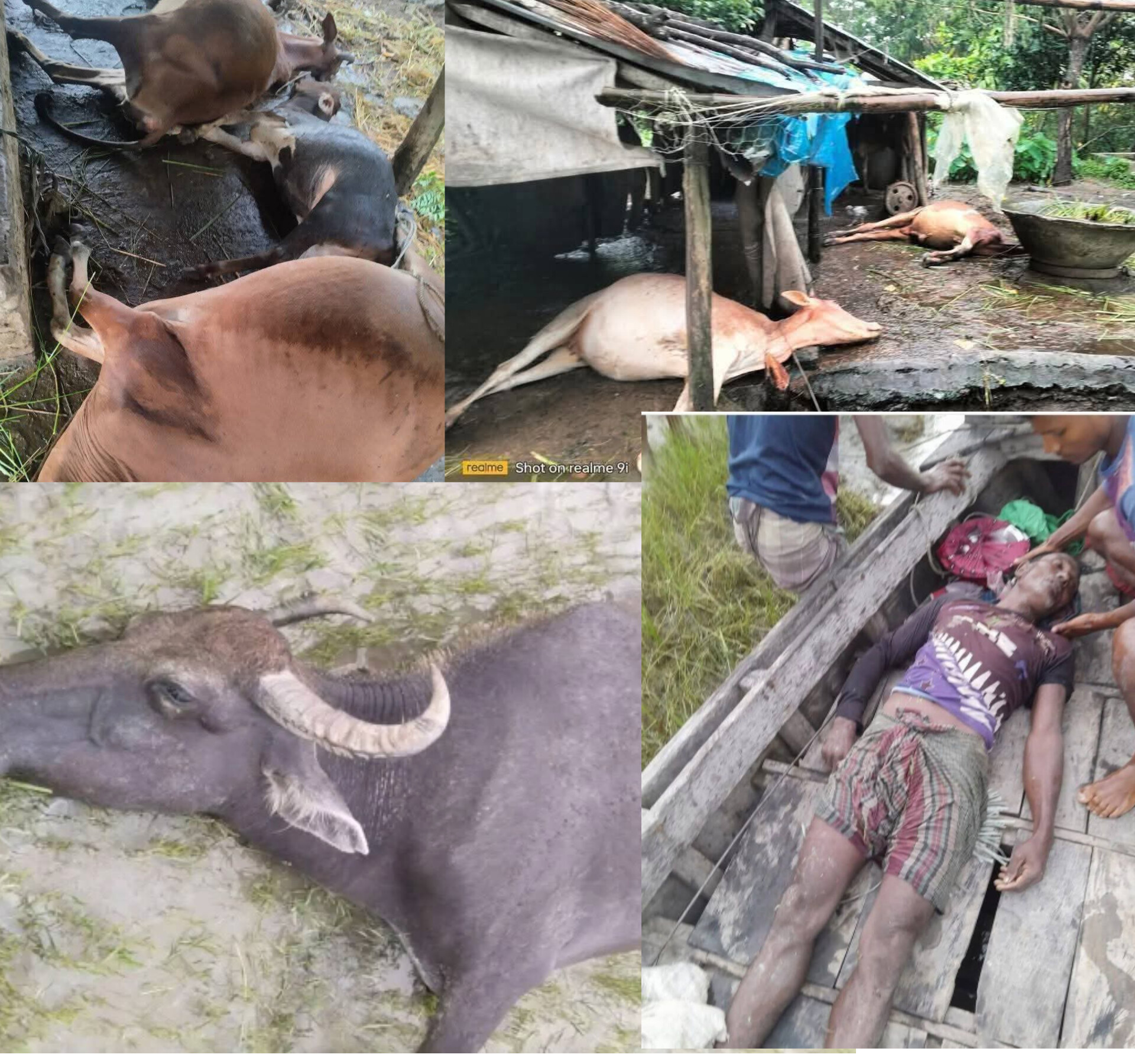 অপরদিকে বজ্রপাত পড়ে উত্তর সাকুচিয়া ইউনিয়নের বাসিন্দা ইয়াসিন ও জাকিরে ২টি গরু, হাজিরহাট ইউনিয়নের চরফৈজুদ্দিন গ্রামের বাসিন্দা জিয়া উদ্দিনের ৩টি গরু, একই ইউনিয়নের চৌধুরী বাজার এলাকার বাসিন্দা শামসুদ্দিনের ১টি মহিষ, কলাতলী ইউনিয়নের ১টি মহিষের মৃত্যু হয়।