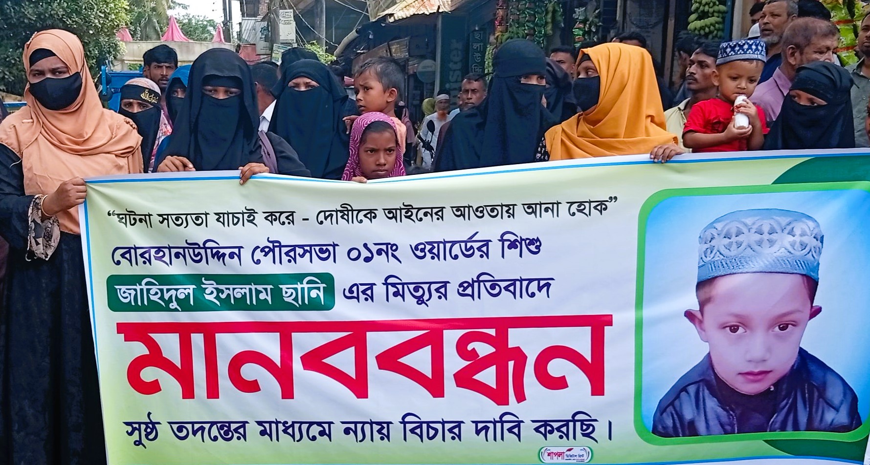 মাদ্রাসা ছাত্র ছানী হত্যা বিচারের দাবীতে ভোলার বোরহানউদ্দিনে মানববন্ধন, সংবাদ সম্মেলন ও বিক্ষোভ মিছিল করেছেন এলাকাবাসী। রবিবার (৫ অক্টোবর) সকল ১১ টায় একটি বিক্ষোভ মিছিল পৌর বাজারের গুরুত্বপূর্ণ সড়ক সমূহ প্রদক্ষিণ করে থানার সামনে গিয়ে মানববন্ধন করেন তারা। নিহত জাহিদুল ইসলাম ছানি উপজেলার গঙ্গাপুর ইউনিয়নের দিনমজুর মোঃ আকবর হেসেনের ছেলে ও পৌর ১নং ওয়ার্ডের আল হেরা ইসলামিয়া মাদ্রাসার তৃতীয় শ্রেণীর ছাত্র।